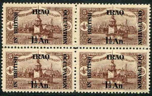 Iraq – British Occupation: 1920 no watermark 1 1/2a. surcharged on Ottoman 5pa Leander’s Tower unmounted mint block of 4. Sg. 4