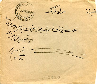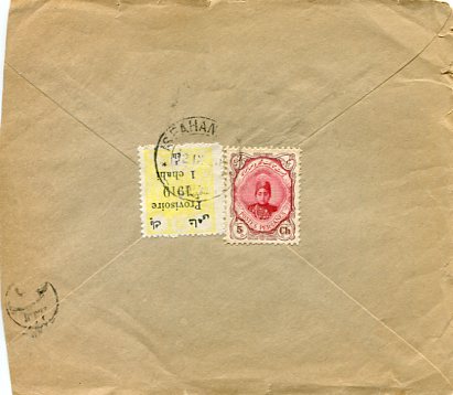 Iran: 1920 (12 September). Cover to Shiraz franked with 5ch Ahmed Mirza definitive and 1ch ‘Provisoire 1919’ surcharged provisional stamp tied by ISFAHAN datestamp and circular Sandouq 1333 (Mail Box 1915) handstamp. Reverse 20 September Chiraz arrival cds. Sg. 365,527
