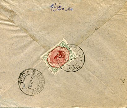 Iran: 1920 (17 March). Cover to Yezd franked on reverse with 6ch perf. 11 1/2 Ahmed Mirza definitive tied by Chahroud datestamp, 22 March Teheran transit and 1 April arrival cds’s. Late usage.