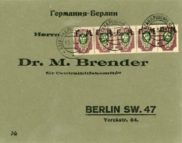1920 Russia Alexandrovsk to Dr Brender Berlin Judaica Cover