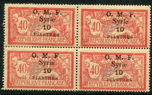 Syria – French Mandate: 1920 (1 May). Merson type stamp of France 10pi surcharged on 40c mint o.g. (one stamp unmounted mint) bock of four. Small creases as expected. Sg. 40. * / **