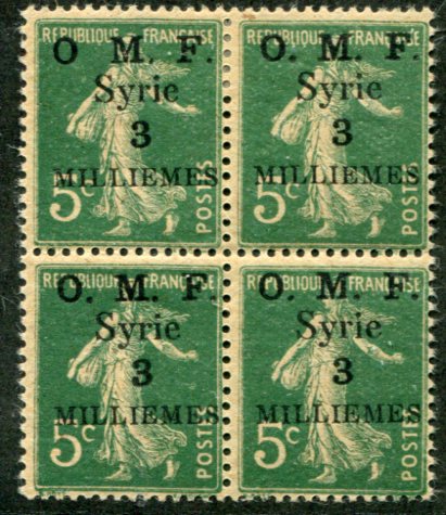 Syria – French Mandate: 1920 (February-March). Sower type stamps of France 3m thick OMF surcharged on 5c unmounted mint (hinged on top) block of four with no dot after O of the O.M.F variety on first stamp. Sg. 27. * / **