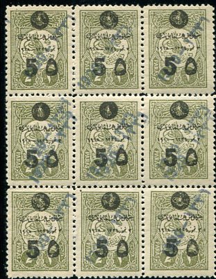 According to the article published in Tughra Times vol 7, no. 3 ten sheets of 100 of these stamps discovered after the printing process in 1920. Per the instructions of the Director of the Dette Publique Ottoman they were handstamped and given the post office for use. Although they were not authorised, they were accepted for postage. Handstamp applied in blue or red. This is the largest recorded block as such. ex. P. Ozand