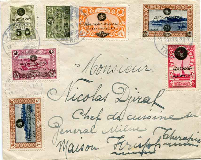 Ottoman Turkey: 1920 (7 July). Philatelically inspired cover to the cook of General Milne who was the Commander in Chief of Allies in occupied Istanbul franked with Accession of Sultan Vahideddin overprinted commemorative stamps of 1919 and tied by Therapia datestamps. Part cover flap missing.