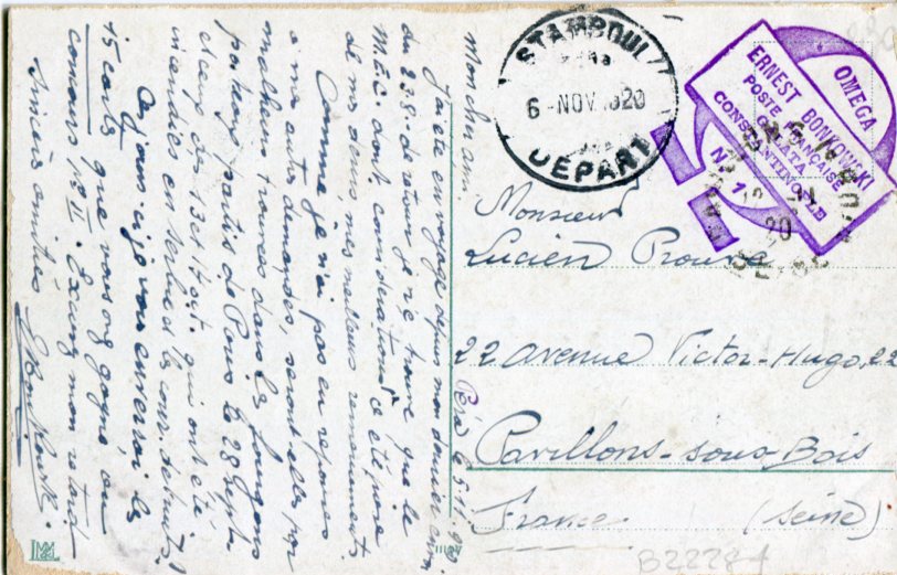 Turkey: 1920 (5 November). ‘Chameaux et l’hopital Bulgare a Constantinople’ titled postcard to France franked with 50pa pictorial stamp tied by dispatch and next day Stamboul transit cds and OMEGA Ernest Bonkowski merchant cachet.