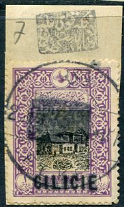 Turkey: 1920 (17 March). Feke National Forces handstamped Provisional issue on small Cilicie handstamped 1pi Ottoman pictorial on piece struck by full datestamp. Isfila YPA29