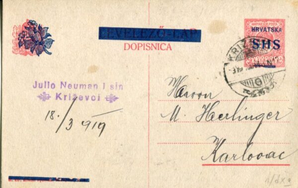 Yugoslavia – Croatia: 1919 (12 March). HRVATSKA SHS (48mm bar) overprinted in 10f Hungarian postal stationery card to Karlovac struck by KRIZEVCI datestamp. Mi. P35Ib