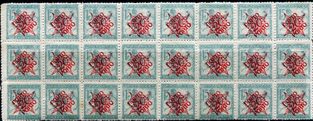 Yugoslavia – Issues for Slovenia: 1920 (5 July). Ljubljana printed postage due stamps surcharged 20p on 15v unmounted mint block of 24. Sg. D166