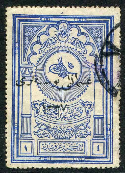 Anatolian Government: 1921 (10 March). Ottoman Post 1337 type V overprinted on 1pi ultramarine Ottoman Museum revenue stamps struck by small part Ankara 8 datestamp. signed Economist. Isfila 1033
