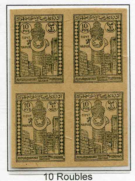 Azerbaijan: 1921-22 print pictorial issue 10r on buff paper unused block of 4 without gum as issued.
