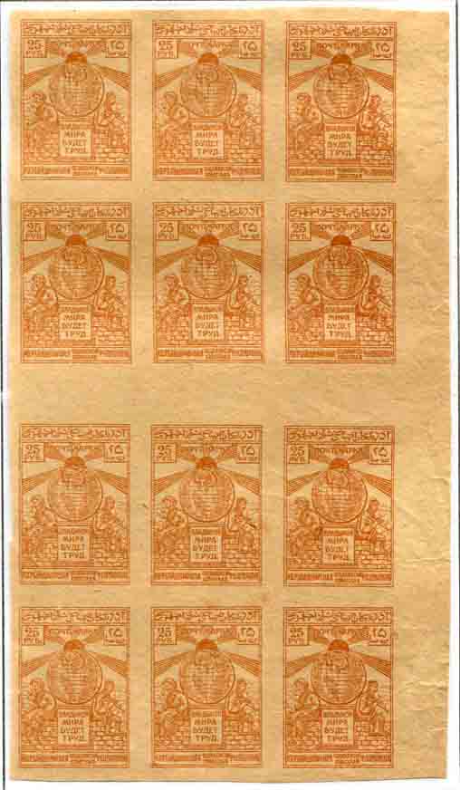Azerbaijan: 1921-22 print pictorial issue 25r on buff paper unused gutter block of 12 without gum as issued.