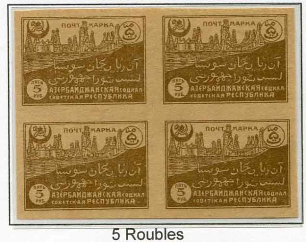 Azerbaijan: 1921-22 print pictorial issue 5r on buff paper unused block of 4 without gum as issued.