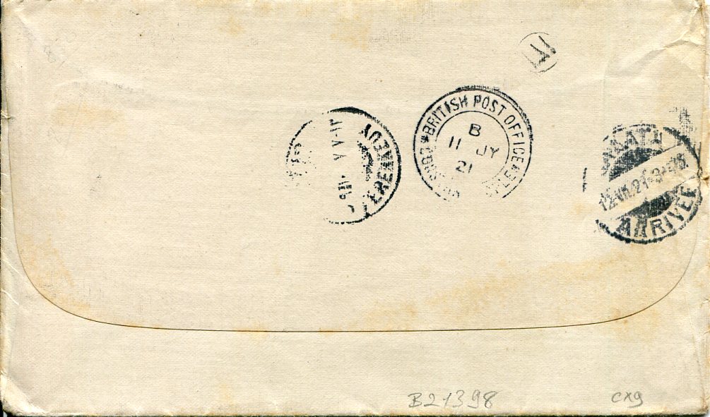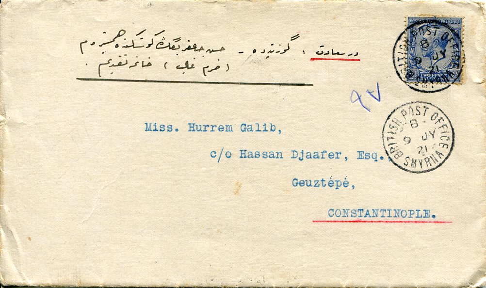 British Levant: 1921 (9 July). Cover to Istanbul franked with KGV 2 1/2d blue tied by BPO Smyrna datestamps. Reverse 11 July BPO Constantinople, next day Ottoman post Galata and 13 July Erenkoy arrival cds’s. Sg. Z287
