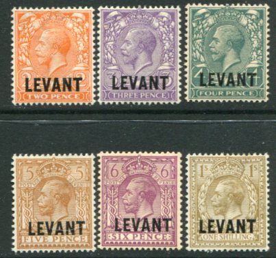 British Levant: 1921 (August). Stamps of KGV overprinted LEVANT mint o.g. values to 1s. Sg. L18/L24. *
