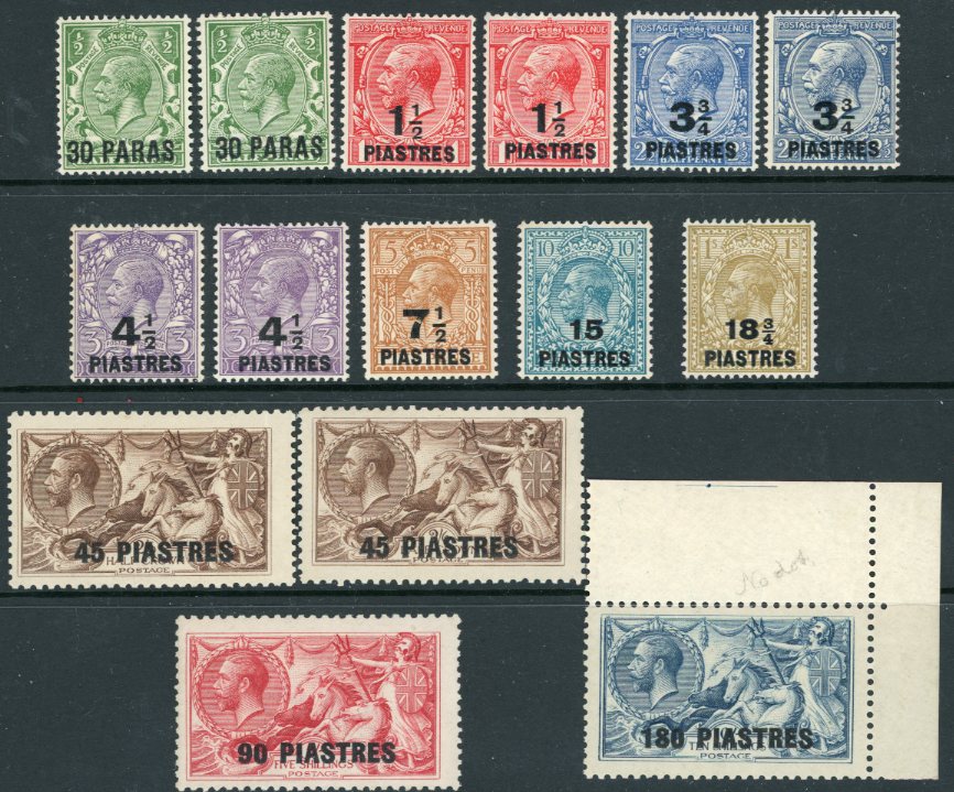 British Levant: 1921 (August). KGV stamps surcharged at Somerset House in Turkish currency mint o.g. set of 10 with additional colour varieties including scarce 3 3/4 dull Prussian blue and 45pi on 2s.6d ‘Joined Figures’ variety. Scarce assembly. Sg. 41/50. 41a, 42b, 43a, 44a, 48a *