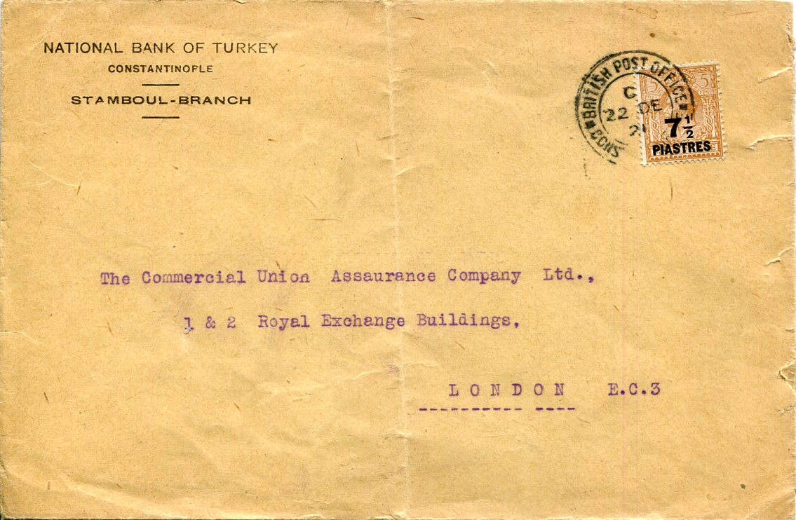 British Levant: 1921 (22 December). National Bank of Turkey imprinted cover to London franked with 7 1/2pi on 5s tied by BPO Constantinople datestamp. Reverse blank