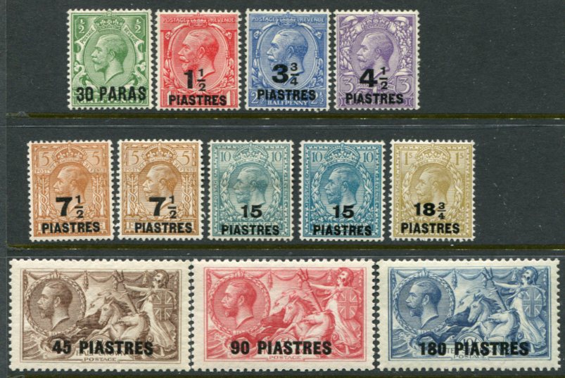 British Levant: 1921 stamps of KGV surcharged mint o.g. set of six additionally 7 ½pi on 5d and 15pi on 10d. colour varities. Sg. 41/50, 45a +. *