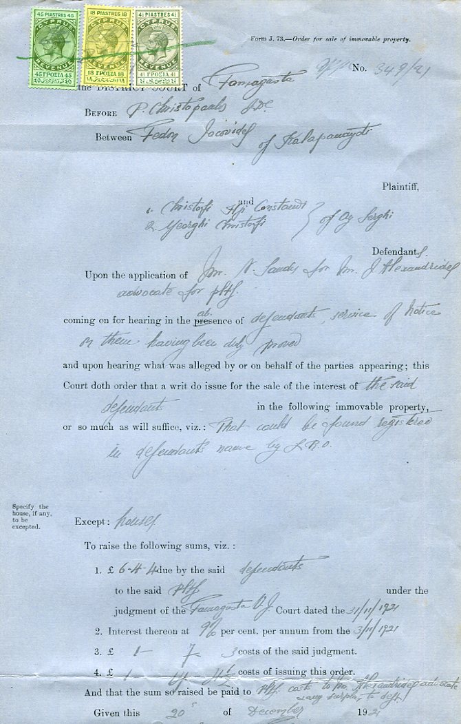 Cyprus: 1921 document franked with 4 1/2pi, 18pi and 45pi KGV revenue stamps and cancelled by manuscript.