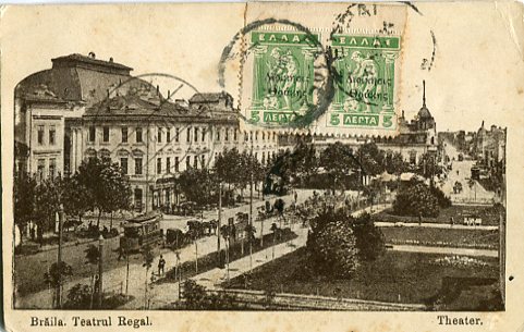 Greece: 1921 (June). Postcard titled ‘Braila. Teatrul Regalto Syros franked with pair of 5l Administration Thrace overprinted Greek stamps tied by RAIDESTOS (Rodosto, Tekirdag, Turkey) datestamps and 19 June Syros arrival cds. Reverse a long message in Ottoman Turkish and Greek. Very rare. Karamitsos 108