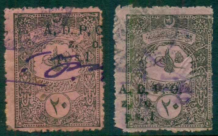 Lebanon – Revenue: 1921 ADPO z.o. surcharged on Ottoman receipts and acquaintances fees revenue stamp, 1ps on 20pa used. Suleymaniye 6016