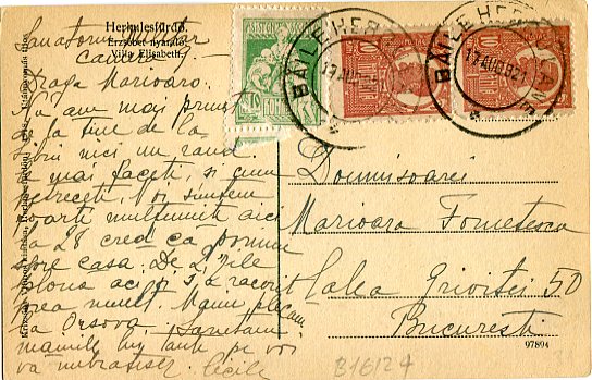 Romania: 1921 (17 August). Postcard titled ‘Herkulesfürdö. Villa Elisabeth’ (ed. Krizsany Vilmos) to Bucharest franked with pair of 10b and 10b Social Welfare Postal Tax tied by BAILE HERCULANE datestamps
