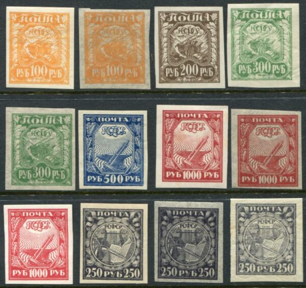 Russia – Soviet: 1921 (August/September). Agriculture and Industry imperforate unmounted mint set, some with paper varieties. Mi. 156a/161a, 156ay, 158y, 158z (small rust spot), 159y, 161az, 161aw. **