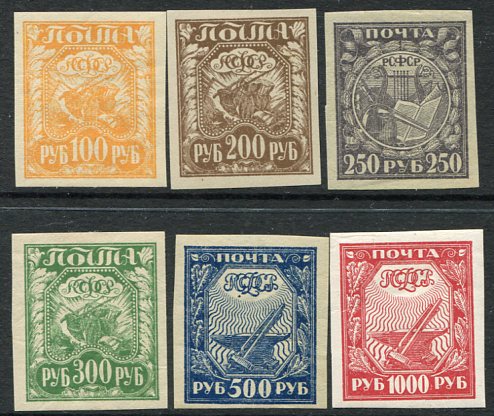 Russia – Soviet Republic: 1921 (25 August). Pictorial definitive issue imperf. on medium paper mint o.g. set of six. Sg. 214/219