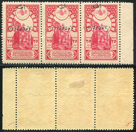 Anatolian Government: 1921 (1 December). Ottoman stamps overprinted to commemorate liberation of Adana and withdrawal of the French Forces 25pi Sentry and Flag of 1917 issue unmounted mint strip of three with date ‘1’ on writing omitted variety. Error is mint o.g. Burak 877IB, Mi. 762I, Sg. A100, Yv. 638