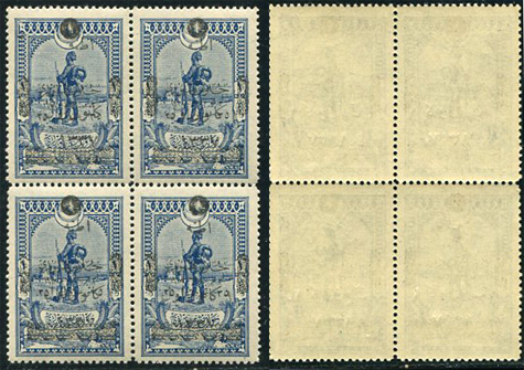 Anatolian Government: 1921 (1 December). Ottoman stamps overprinted to commemorate liberation of Adana and withdrawal of the French Forces previously overprinted 35pi on 1pi of Sultan’s Accession issue unmounted mint block of four. Mi. 763II, Sg. A109, Yv. 639