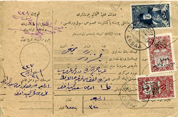 Turkey – Anatolian Government: 1921 (24 June). Money order to Kütahya franked with type VII ‘Osmanli Postalari 1337’ overprinted 2pi surcharged on 1pi and 5pi surcharged on 1pi Hejaz Railway Aid and 50pi Ottoman pictorial stamps tied by Erbaa (A&P type 3 – R) bilingual datestamps. Reverse 26 June Tokat 1 (A&P type 13), 30 June Sivas 4 (A&P type 13 – RR) transit and 10 July Kutahia (A&P type 8) arrival cds’s. Stamps slitted as required. Sg. A61, A62 – Isfila 716, 1040, 1041