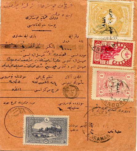 Turkey – Anatolian Government: 1921 (24 August). Money order to Karaman franked with ‘Osmanli Postalari 1337’ handstamped on 50pi buff Ottoman Ministry of Justice Tribunals and overprinted on 5pi Ministry of Finance with overprint inverted error, 10pi and 25pi Ottoman pictorial stamps tied by Ankara – Angora 8 (A&P type 24 – R) bilingual datestamps and 12 September arrival cds’s. Stamps are slitted as required by the authorities. Isfila 939, 977