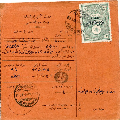Turkey – Anatolian Government: 1921 (3 March). Money order to Inebolu franked with type I ‘Osmanli Postalari 1336’ handstamped 50pi grey-green Ottoman Religious Tribunals revenue stamp tied by Ankara – Angora 3 bilingual datestamp and 11 March arrival cds. Stamp slitted as required. Sg. A19, Isfila 968