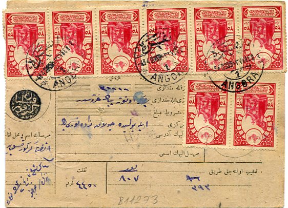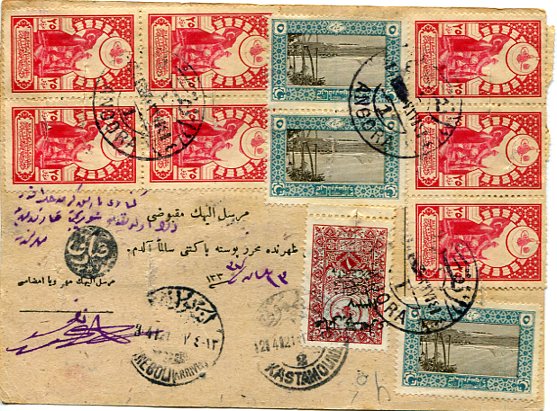 Turkey – Anatolian Government: 1921 (4 April). Money Order to Inebolu franked with type VII ‘Osmanli Postalari 1337’ overprinted on 2pi surcharged 1pi Hejaz Railway Aid fiscal, three 5pi and fifteen (8 on front) 25pi Ottoman pictorial stamps tied by Ankara – Angora 1 (A&P type 6) bilingual datestamps, 12 April Kastamonu 2 transit and next day arrival cds’s. Stamps slitted as required. Sg. A6145 – Isfila 719, 887, 1040