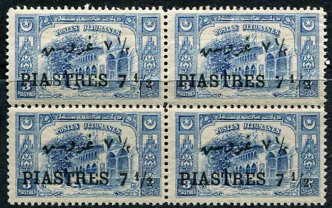 Ottoman: 1921 surcharged postage stamps 7 1/2pi on 3pi black surcharge unmounted mint block of four with large “2” on 1/2 error. Isfila 945 SE 133, Sg. 973var