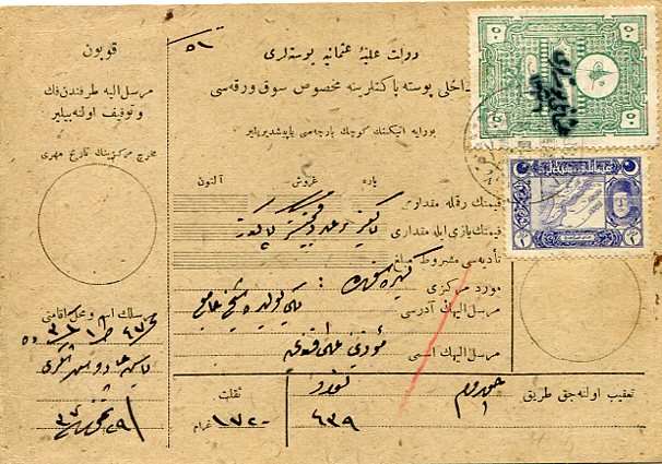 Turkey – Anatolian Government: 1921 (28 July). Money order to Giresun franked with type I ‘Osmanli Postalari 1336’ handstamped 50pi grey-green Ottoman Religious Tribunals revenue and 1pi Ottoman pictorial stamps tied by Çorum – Tchoroum (A&P type 7) bilingual datestamp. Reverse 1 August Merzifun – Merzifoun 1 (A&P type 6 – R), 4 August Samsun – Samsoun 4 (A&P type 20) transit and 9 August Kerassounde 1 (A&P type 8 – R) arrival cds’s. Stamp slitted as required. Sg. A19, Isfila 884, 968