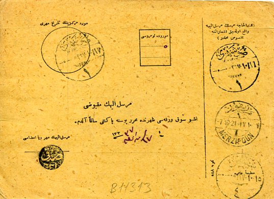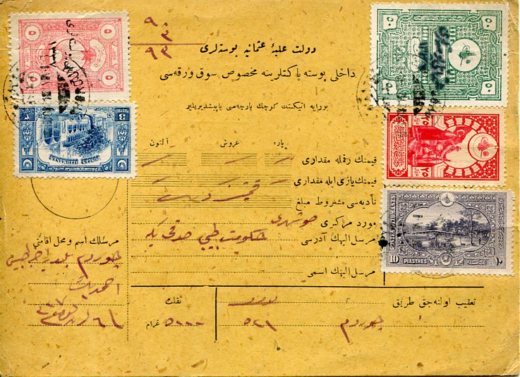 Turkey – Anatolian Government: 1921 (6 October). Money order to Susehri franked with type I ‘Osmanli Postalari 1336’ handstamped 50pi grey-green Ottoman Religious Tribunals, overprinted 5pi Ministry of Finance, 3pi, 10pi and 25pi Ottoman pictorila stamps tied by Corum – Tchoroum (A&P type 7) bilingual datestamp. Reverse 7 October Merzifon, 15 October Sivas transit and 16 October arrival cds’s. Stamps slitted as required. Sg. A19, A74 Isfila 968, 1050