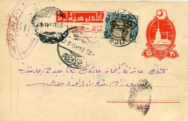 Turkey – Anatolian Government: 1921 (18 June). 20pa postal stationery card to Istanbul also franked with bisected 5pi of 1917 pictorial stamp to make up three piastres internal postcard rate according to 6 June 1921 domestic rate schedule tied by INEBOLU – INEBOLI (A&P type 9) bilingual datestamp and struck by oval negative censor seal and Greek merchant cachet alongside 20 June arrival cds’s. Scarce usage of postal stationery card of this period. Seldom seen. Vertical crease.