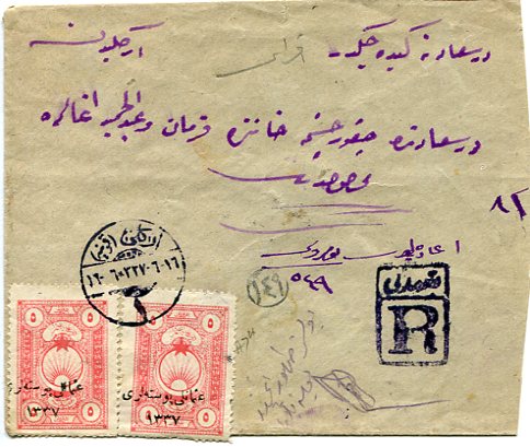 Turkey – Anatolian Government: 1921 (16 June). Registered cover to Istanbul franked with two type VII ‘Osmanli Postalari 1337’ overprinted 5pi Ministry of Finance fiscal stamps for five piastres internal letter and five piastres registration rate tied by Ereğli (Konya) 1 (A&P type 5, R) datestamp. Reverse 22 July Ankara – Angora 5 transit, appeared to be oval Inebolu negative censor cachet and 3 July Istanbul Mevrude 52 (A&P type 60, R) arrival cds’s.