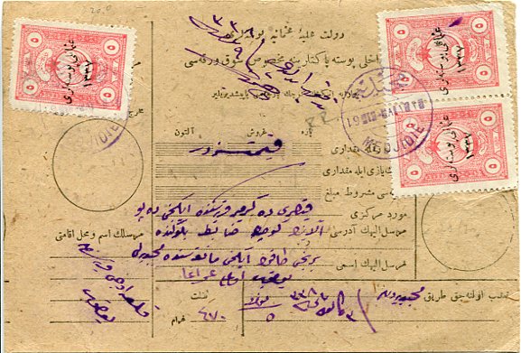 Turkey – Anatolian Government: 1921 (16 December). Money Order to Kırşehir franked with type VII ‘Osmanli Postalari 1337’ overprinted single and a pair of 5pi Ministry of Finance fiscal stamps tied by Mecidiye – Medjidie (vilayet Ankara, A&P type 3 – RR) datestamp. Reverse 28 December Kayseri – Cesaree 2 transit and 3 January 1922 Kırşehri – Kirchehri 1 (vilayet Ankara, A&P type 6, RR) arrival cds’s.