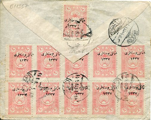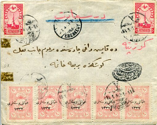 Turkey – Anatolian Government: 1921 (19 June). Cover to Istanbul franked with type VII ‘Osmanli Postalari 1337’ overprinted single and three strips of five 10pa rose Ministry of Finance and two 20pa Ottoman pictorial stamps for single weight five piastres internal letter rate tied by Ankara 8 (A&P type 10) datestamps, 3 July Erenkoy arrival cds and oval negative Inebolu censor cachet. Sg. A71 – Isfila 883, 1048