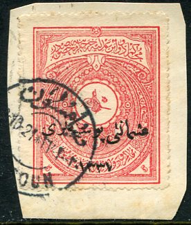 Anatolian Government: 1921 (2 March). Ottoman Post 1337 type III overprinted on 5pi carmine Ottoman Law Courts & Offices revenue stamp on piece struck by almost full Samsun – Samsoun datestamp with broken 7 on Arabic date (first setting, position 20) variety. Isfila 1019SE314