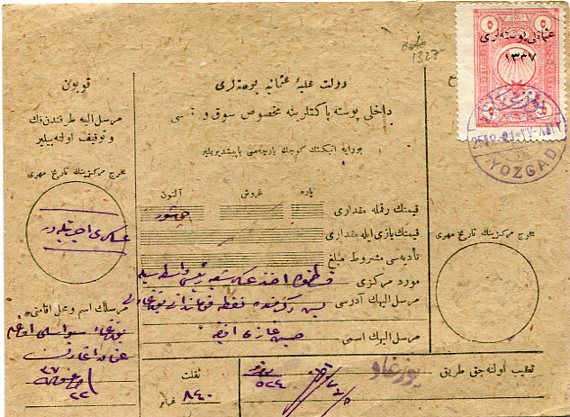 Turkey – Anatolian Government: 1921 (22 August). Parcelcard to Kastamonu frankedwith 5pi OSMANLI POSTALARI 1337 overprinted Ottoman Ministry of Finance fiscal stamp with small “2” reading 1327 variety tied by Yozgad 36 (A&P type 9) bilingual datestamp. Reverse same day Kengari 1 (today Çankırı) transit and next day arrival cds’s.