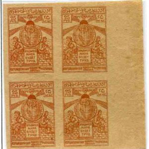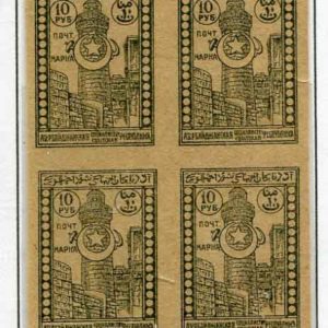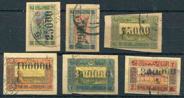 Azerbaijan: 1922-23 handstamped from metal dies on 1919 pictorial stamps 25,000r on 10k to 300,000 on 2r used values. Scott 57/62