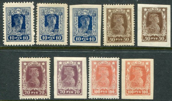 Russia – Soviet: 1922 (December) – 1923 (January). Worker and Soldier unmounted mint imperforate set and various perforation varieties. Mi. 208D/211D, 208B,C, 209A, 210A, 211A – Sg. 303/306, 308/310, 311, 312. **