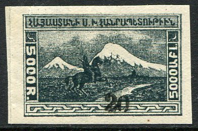 Armenia: 1922 (April). Second Constantinople Issue 5000r imperf. Mount Ararat design surcharged 20 (gold kopek) in black mint o.g. Sold as Genuine. Mi. 166. *