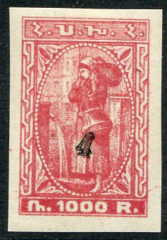 Armenia: 1922 (April). Second Constantinople Issue 1000r carmine imperf. Woman at Well design surcharged 4 (gold kopek) in black mint o.g. Sold as Genuine. Mi. 162a. *