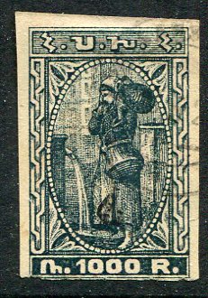 Armenia: 1922 (April). Second Constantinople Issue 1000r slate imperf. Woman at Well design surcharged 4 (gold kopek) in black used. Sold as Genuine. Mi. 162b.