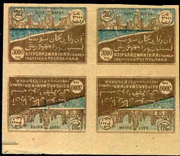 Azerbaijan Soviet Republic: 1922 (1 January). Bibi Eibatt Oil Field design 3000r unused imperforate tete-beche block of four. Sc. 28a, Sg. 24a. (*)
