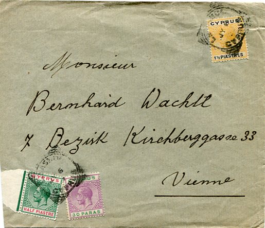 Cyprus: 1922 (6 July). Cover to Vienna, Austria franked with 30pa, 1/2pi and 1 1/2pi KGV stamps tied by Larnaca datestamp. Reverse blank.