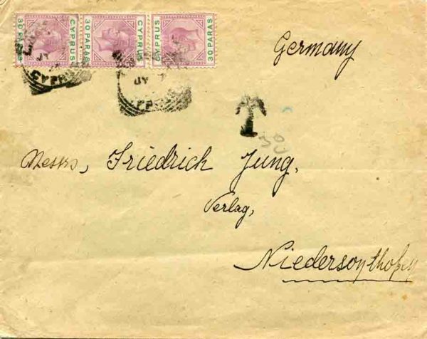 Cyprus: 1922 (7 July). Cover to Germany franked with single and a pair of 30pa KEVII stamps and tied by Limassol datestamps. Cover under franked and taxed with ‘T’ handstamp and 30c by manuscript.